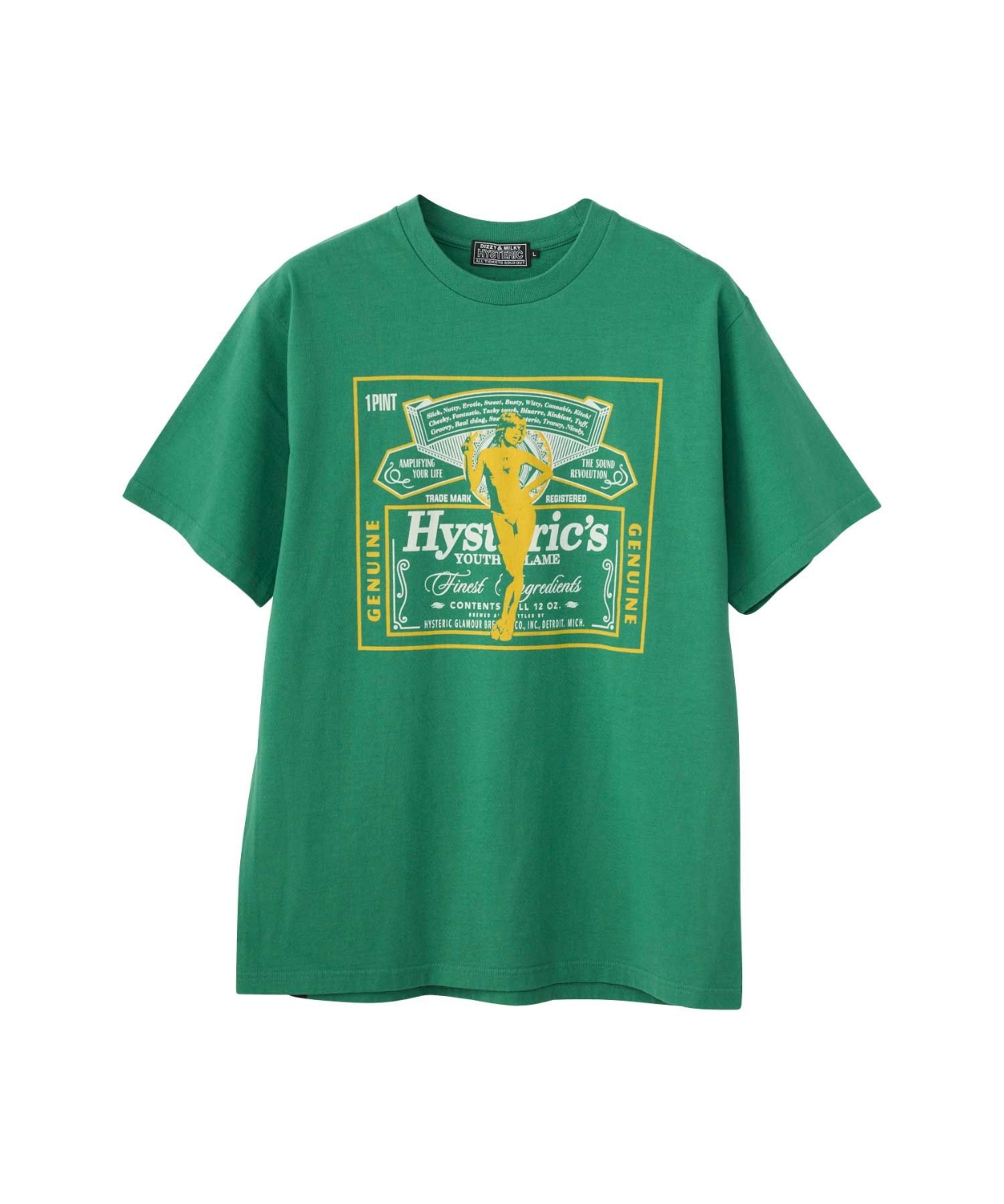 HYSTERIC WOMANのアイデンティティを詰め込んだ文言と、パロディ要素を組み合わせたシャレの効いたデザインのTシャツ。